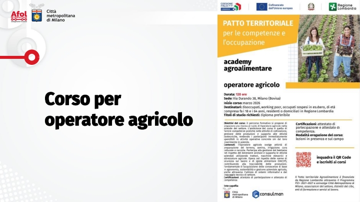 - Operatore/trice Agricolo/a (120 ore – Sede: Milano Bovisa, partner Consulman).