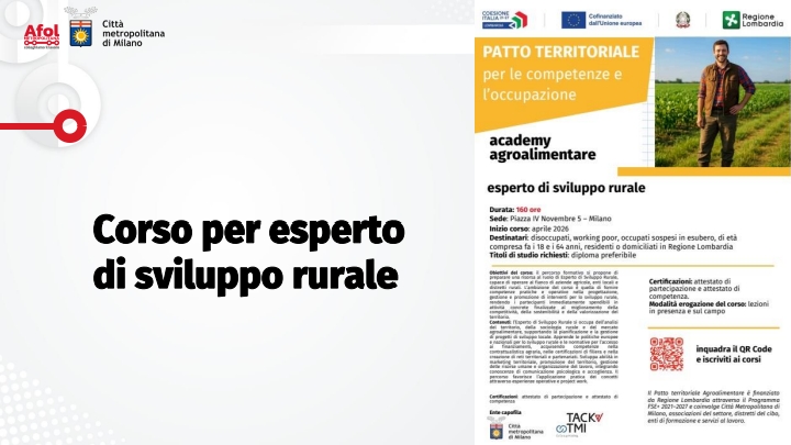 - Esperto/a nello Sviluppo Rurale (160 ore – Sede: Milano Stazione Centrale, partner TACK TMI).